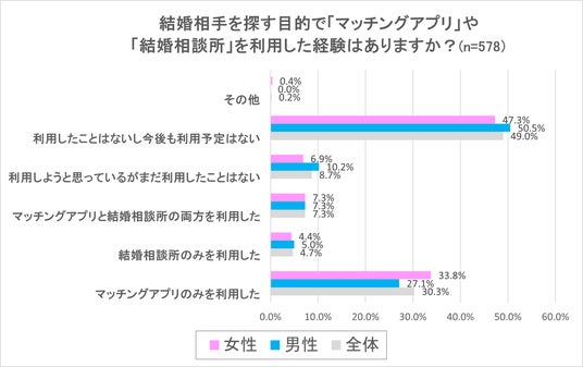 一方で全体の約半分にあたる49.0%は、マッチングアプリや結婚相談所の利用経験がなく、今後も利用するつもりはないという回答結果となりました。