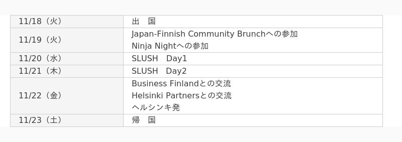 内 容:SLUSHへの参加:ミーティング、ステージプログラム、サイドイベント、ブース見学