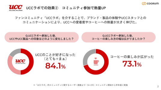 顧客のホンネデータを収集・分析するプラットフォーム「coorum(コーラム)」を展開する株式会社Asobica(本社:東京都品川区、代表取締役社長 兼 CEO:今田 孝哉)は、UCC上島珈琲株式会社(本社:兵庫県神戸市、代表取締役社長:芝谷 博司)へ「coorum(コーラム)」を提供いたしました。 同プラットフォームを活用したファンコミュニティ「UCCラボ」において、コミュニティ参加により会員の年間購入金額が約1.9倍に増加するといった購買行動の変容や、参加者の84%においてブランドに対する好意度が向上するといった効果が実証されました。