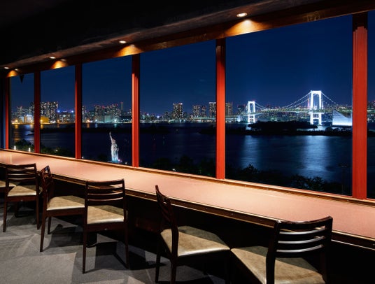 お台場店は2000年4月1日に人気の観光エリア・お台場にある「アクアシティお台場」の6階にオープンいたしました。店内は船室や港の酒場をモチーフにした内装を施しており、落ち着いた雰囲気でゆったりとお食事をお楽しみ頂けます。また、特筆すべきは窓から見えるまるで宝石のような「抜群の景色」。レインボーブリッジ・東京タワー・東京湾が一望出来、昼夜を問わず素晴らしい光景が広がります。特にカウンター席から見る景色は圧巻で、カップルのお客様を中心に人気のお席となっております。