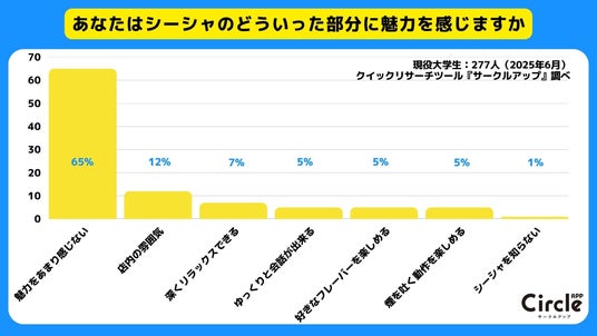 3つ目の質問として「シーシャのどういった部分に魅力を感じるか」といった旨の質問を投げかけました。結果としてはなんと65%もの若者が「魅力を感じない」と考えていることが分かりました。