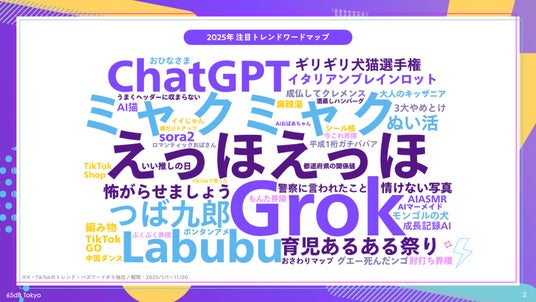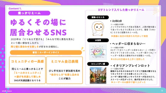 Xでは「エッホエッホ」「ヘッダーに収まらない…」、TikTokでは「イタリアンブレインロット」などが急増し、ミニマムな自己表現で“同じ場に居合わせる”体験が好まれました。