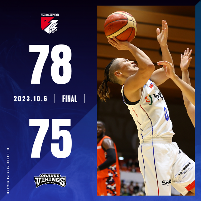 2023年10月6日(金)に開催されました【ライジングゼファーフクオカvs.愛媛オレンジバイキングス】において“福岡78-75愛媛”の結果となりましたことお知らせいたします。