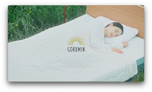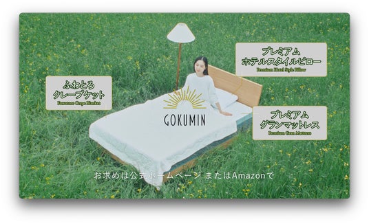 新CMでは、GOKUMINが誇る「プレミアムグランマットレス」の特長を紹介。高密度・高反発素材を活かし、腰痛改善や快適な寝心地を実現する特徴を強調しています。また、使い勝手の良い三つ折りタイプや、頭、腰、脚の3ゾーンを搭載した2層構造のマットレスが、個々の寝姿勢をサポートし、睡眠の質を向上させることを伝えています。