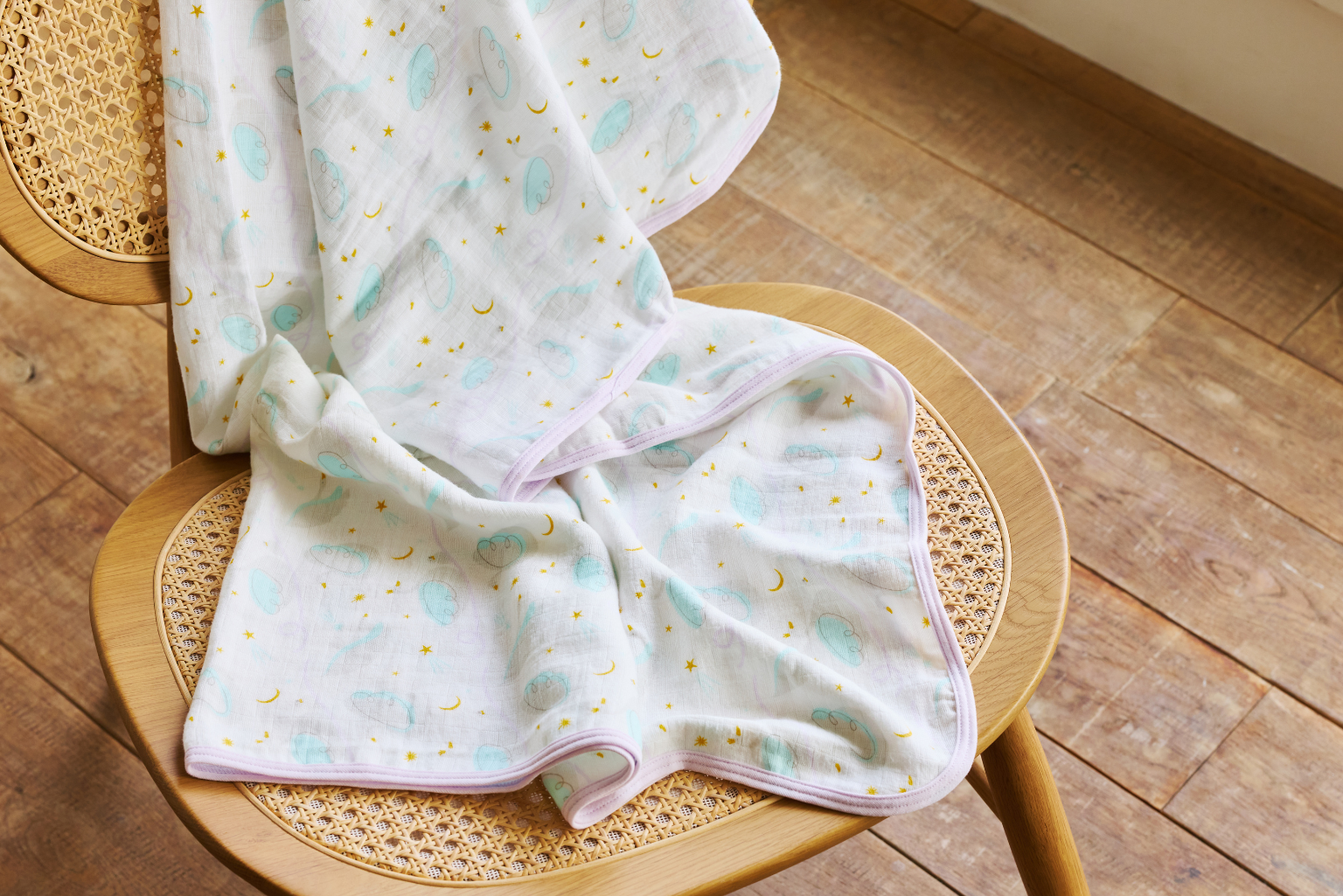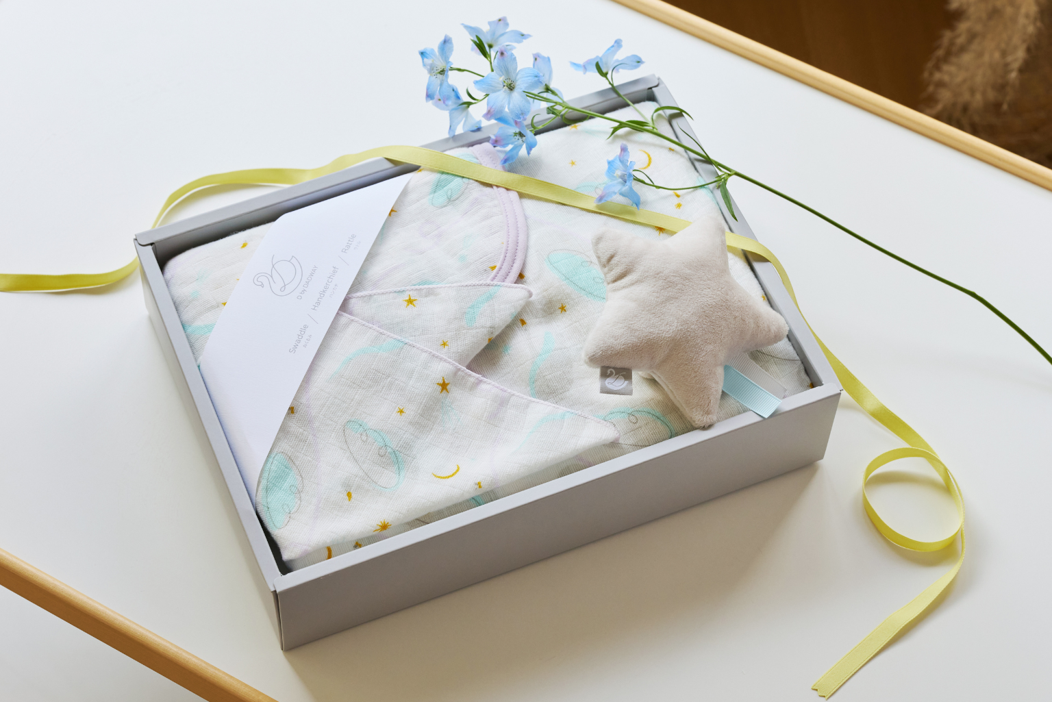 新登場の“スワンレイク”は、おめかしした白鳥の親子を描いた優雅な雰囲気のテキスタイル。ラベンダーカラーの縁取りがデザイン、そして赤ちゃんの愛らしさを一層引き立てます。家族みんなに穏やかな時間が流れますようにという願いから誕生したアイテムは、心温まる出産ギフトとして喜ばれることでしょう。