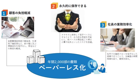当社は、クラウド型の電子契約サービス「CLOUDSIGN(クラウドサイン)」を導入し、不動産投資コンサルティング事業と建築請負事業、2つの部署で発生する契約書類を電子化いたしました。電子化した具体的な契約書類の内容といたしましては、不動産投資コンサルティング事業においては契約時の重要事項説明書や物件状況報告書、決済時の受領書及び引渡完了確認書など、計10種類。建築請負事業においては契約時の建築工事請負契約書や委任状、引き渡し時の追加・変更工事御注文承り書、建物お引お引き渡し清算書など、計7種類となります。月間平均契約数で算出すると、年間約2,000部にのぼる契約書類のペーパーレス化を実現できる取り組みとなります。
