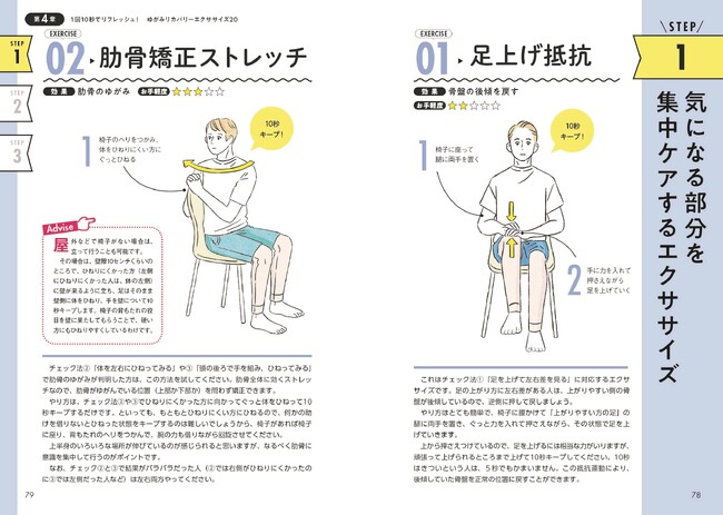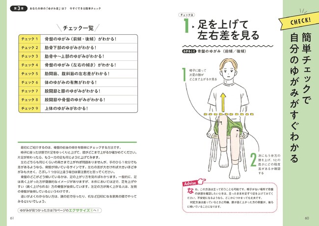 ゆがみを直すには、自分の状態を正確に知ったうえで、状態に応じたエクササイズを行う必要があります。本書では簡単チェックで自分のゆがみの部位を把握することができ、「部位別ゆがみ」「全身のゆがみ」「チェック兼エクササイズ」の3ステップで、体の状態チェックとゆがみの矯正を行っていくことができます。