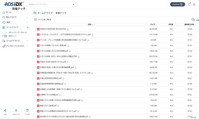 「防衛データプラットフォーム AOS IDX」は、厳格かつ柔軟なアクセス権限管理機能や、ドキュメントへの検索用メタデータ付与によるデータ検索性の強化、AIデータ活用に向けたマルチモーダルAIへの対応、ファイルビューアー機能、暗号化および監査機能、バックアップ機能、および大容量長期保管向けアーカイブシステム機能を備えています。AOS IDXは、安全データ共有が求められるすべての防衛産業向けに設計されたクラウドストレージシステムです。