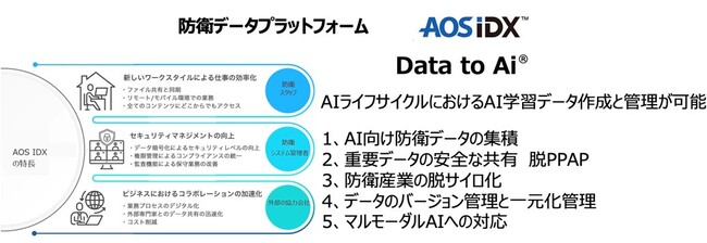 クラウドデータ、システムデータ、リーガルデータ、AIデータなどのデータアセットマネジメント事業を展開するAOSデータ株式会社(本社:東京都港区、代表取締役社長 春山 洋 以下 AOS データ社)は、防衛産業の効率化が求められている日本において、防衛テックで多種多様な情報を共有、保存できる防衛データプラットフォームの構築を支援し、AIによるデータ分析や活用につなげることができる「防衛データプラットフォームAOS IDX」(https://AOSIDX.jp/)のInside実装サービスを、2023年4月6日より販売開始することをお知らせします。