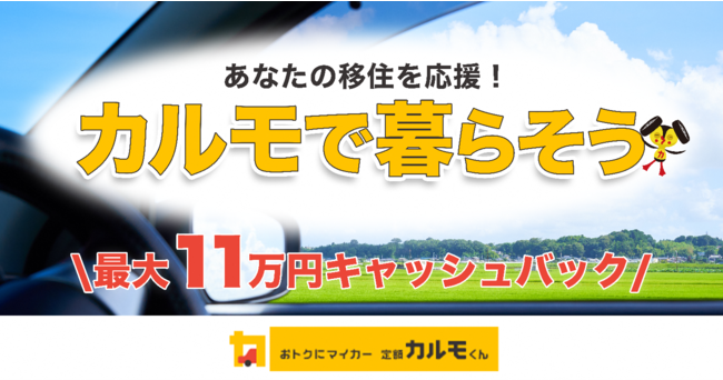 長崎県への移住定住を機に、カーリースサービス「定額カルモくん」をご契約いただいた方に、移住応援金として最大11万円をキャッシュバックいたします。