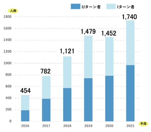 長崎県へのUIターン者数は右肩上がりに増加しています。2021年度に県外から県・市町の窓口を通して長崎県に移住してきた人は、1,740人に上りました。5年前の2016年度と比較すると約4倍に増加しており、長崎県への移住の注目度が高くなっているのがみてとれます。