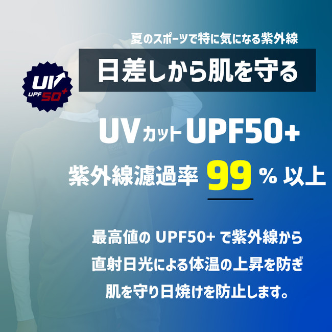 最高値のUPF50+で紫外線から肌を守り日焼けを防止します。