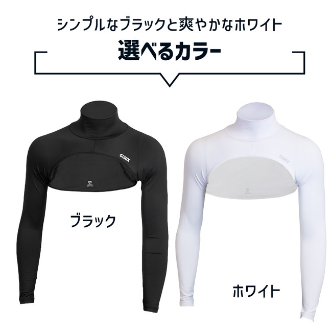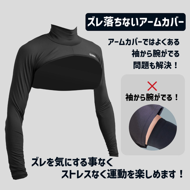 ハイネックで首元までしっかりUV対策が可能な、被るタイプのズレないアームカバーです。接触冷感とUVカットの機能を兼ね備えており、夏のスポーツに最適です。