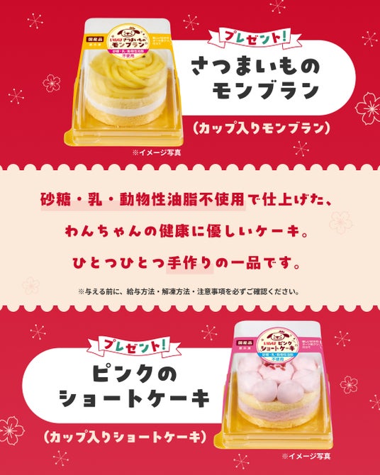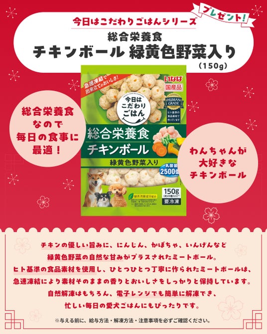 - 賞品:わんちゃんの健康にやさしい大人気のスイーツ2種と、新商品のごちそうプレート「ハンバーグとさつまいもサラダ」、大人気のチキンボールの4品