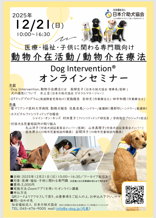 日本介助犬協会【https://s-dog.jp/】が取り組んでいるDog Intervention(R)についてのセミナーを12/21(日)にオンラインで開催する