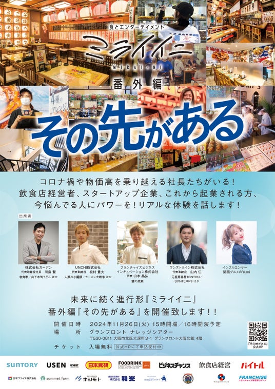 香ばしい味わいが人気の帯広豚丼「元祖豚丼屋TONTON」や、カフェ&韓国ドーナツ「BONTEMPS」など飲食FCを展開するワンズトライン株式会社(本社:大阪市北区芝田2丁目3番16号、代表取締役:山内仁)が、食とエンタメの祭典『ミライイニ』の番外編として、24年11月26日(火)大阪・グランフロント ナレッジシアター(大阪市北区大深町3-1 グランフロント大阪北館 4階)にて開催する『その先がある』のタイムテーブルが決定いたしました。