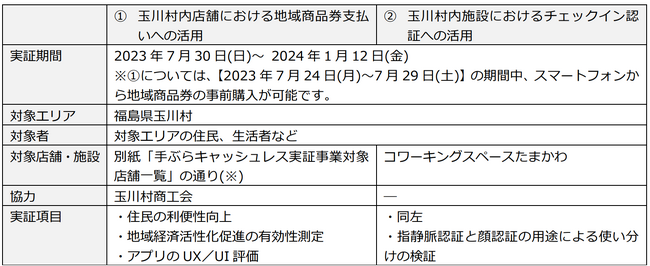 本実証は、昨年度実施した、指静脈認証による「1.玉川村内店舗における地域商品券支払いへの活用」と本年度の新たな取り組みである、顔認証による「2.玉川村内施設におけるチェックイン認証への活用」を並行して行います。具体的には専用装置を用いた厳格な当人認証を行える指静脈認証と、個人のスマートフォンから手軽に登録や本人認証が行える顔認証の使い分けを検証します。加えて、今後の本格的な住民へのサービス適用に向けた実証の一つとして、玉川村役場職員の勤怠管理を顔認証で行います。