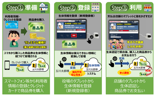 玉川村で発行する地域商品券を指静脈認証で支払い可能とする取り組みで、デジタル技術の活用やキャッシュレス化による住民に対する利便性向上、村内の店舗における消費の活性化を目的とします。利用者は指静脈情報を事前登録することで、村内の協力店舗にて専用端末に手をかざすだけで玉川村の地域商品券が利用できます。