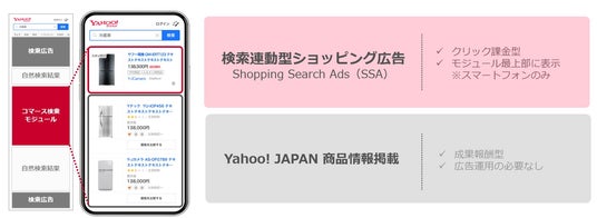 商品情報掲載・検索連動型ショッピング広告は、LINEヤフーが 2023 年 12 月にリリースした Yahoo!検索で商品情報を検索した際に表示される「コマース検索」モジュールに、新たに商品情報を掲載できるサービスです。
