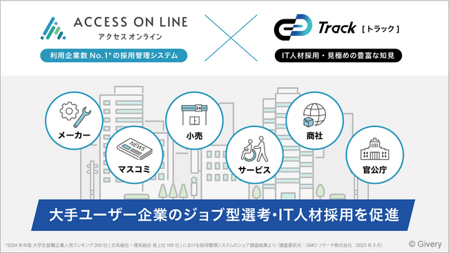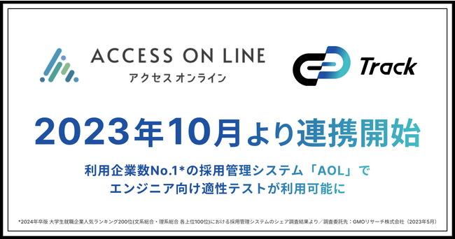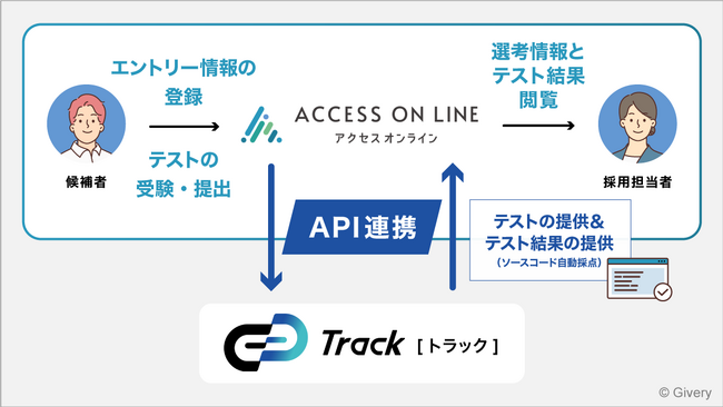 株式会社ギブリー(本社:東京都渋谷区、代表取締役社長:井手高志、以下当社)が展開する国内No1(*2)のコーディングテストツール「Track Test(トラック・テスト)」は、株式会社マイナビ(本社:東京都千代田区、代表取締役:土屋 芳明、以下マイナビ)が提供する採用管理システム「アクセスオンライン(ACCESS ON LINE)」(以下AOL)との連携を10月より開始することを決定いたしました。