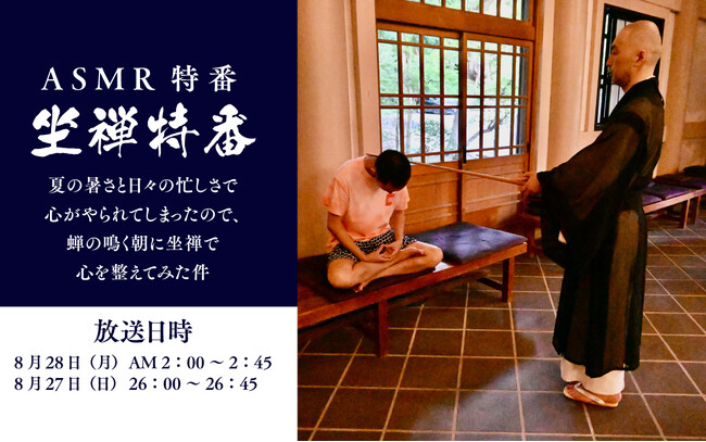 文化放送は、8月28日(月)午前2時00分~2時45分(8月27日(日)26時00分~26時45分)にASMR特番『坐禅特番~夏の暑さと日々の忙しさで心がやられてしまったので、蝉の鳴く朝に坐禅で心を整えてみた件~』を放送します。