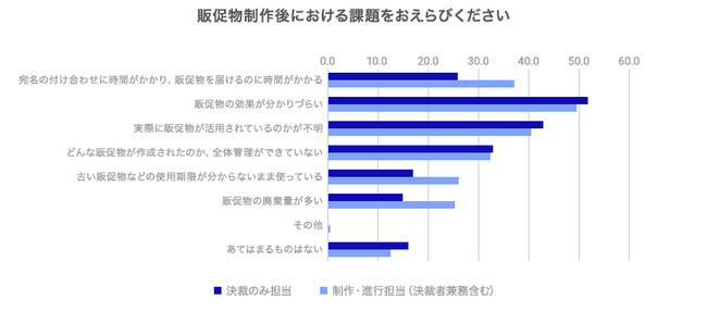 販促物制作後における課題は「販促物の効果が分かりづらい」(50.0%)、次いで「実際に販促物が活用されているのか不明」(41.1%)、「宛名の付け合せに時間がかかり、販促物の送付に時間がかかる」(35.3%)