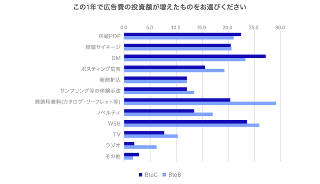 BtoC企業において販促活動投資予算が増えた媒体1位は「DM」(27.4%)、次いで「WEB」(23.6%)、「店頭POP」(22.5%)
