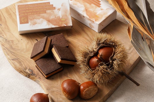 ブロンドチョコレートを使ったガナッシュに栗をあわせ、さっくりとしたビターなクッキーでサンドしました。香り高くほんのり甘い栗の風味と、キャラメルのようにコクのある甘さをもつブロンドチョコレート、そしてそれらをひきたてるビターなクッキーが合わさることで、まるでモンブランスイーツのような贅沢で満足感のある味わいをお楽しみいただけます。