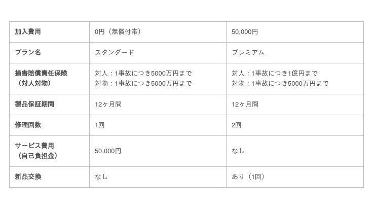 1年間の修理費用サポートや賠償責任保険など、2つのプランから用途に合わせた保証内容が選択可能