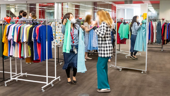 千葉市役所を通じて避難民の方々の需用をヒアリングしたところ、ウクライナより着の身着のまま避難されてきたため、衣服が不足していることがわかりました。ただ単に寄付するのではなく、当社が大切にしている「ショッピングの楽しさ」を感じていただくため、当社オフィスに寄付候補のアパレルおよびその他雑貨を陳列し、実際に避難民の方々に物品を手に取って選んでいただいたものを寄付いたしました。また、寄付会場には避難民の方々が時間を気にせず物品を見られるように、お子様が遊べるキッズスペースや、物品をお試しいただく試着室を用意いたしました。