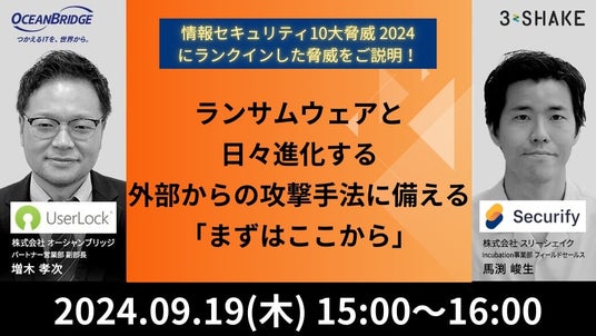 株式会社スリーシェイク(本社:東京都新宿区、代表取締役社長:吉田 拓真、以下スリーシェイク)は、株式会社オーシャンブリッジと共同で、「ランサムウェア攻撃」の最新手口と、外部攻撃から社内システムを守るための具体的な対策方法について解説する無料オンラインセミナーを、2024年9月19日(木)に開催いたします。