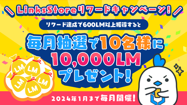 2024年1月31日(水)まで、リワード達成によるLM(リンクスマイル)獲得が600LM以上となった方を対象に抽選で10,000LMをプレゼントするキャンペーンを開催いたします。