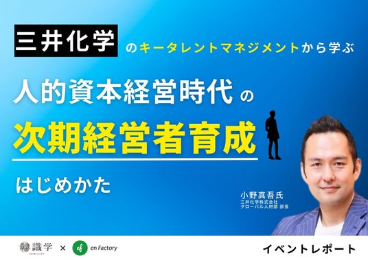 株式会社エンファクトリー(東京都千代田区、代表取締役社長CEO加藤健太、以下、弊社)は、2024年6月13日(木)12時から13時に『人的資本経営時代の次期経営者育成のはじめかた~三井化学のキータレントマネジメントの成果事例とポイント~』ウェビナーを開催しました。次期経営者候補の戦略と組織・体制作りの推進のため、当日の内容をまとめたイベントレポートを公開します(ダウンロード先:https://life-design.enfactory.co.jp/2454)