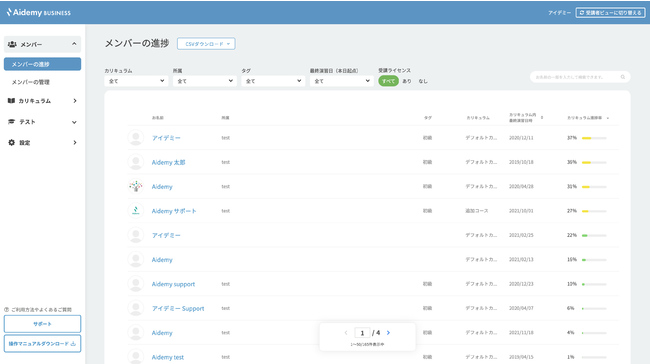 学習進捗の可視化、理解度チェックテスト、データ出力など、学習を促進するための機能が充実。また、専任のカスタマーサクセスが学習を強力にサポートします。