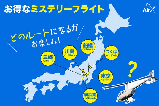 株式会社AirX(本社:東京都千代田区、代表取締役:手塚 究、以下「AirX」)は、ヘリコプターが税抜15,000円で乗れる「ミステリーフライト」の販売を開始することをお知らせいたします。