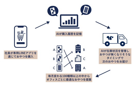 さらに、今回ローンチした新機能をご活用いただくことで、オフィスで専用LINEアプリを通じて販売されたおやつのデータを分析し、AIがオフィス毎に、バラエティ豊富なおやつの中から最適なおやつを提案します。それだけではなく、販売状況に合わせて次のおやつがお届けされるため、フードロスやおやつの在庫切れを最小にすることができます。