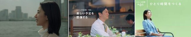 TVCM新バージョンでは、これまでに放映した♯1 ひとり時間をつくる篇、♯2プチ日光浴篇に続き井浦新さん、黒島結菜さんが日常の中で簡単に取り入れることができる、新たな2つの「ひといき習慣」を提案します。また、今回のCM放映を記念し特設サイトを開設しました。専門家、漫画家、人気YouTuber達が「ひといき習慣」の重要性や実践方法を紹介するコンテンツや主題歌を担当する21歳のアーティスト、imaseさんのインタビューも公開します。こちらも合わせてぜひご覧ください。