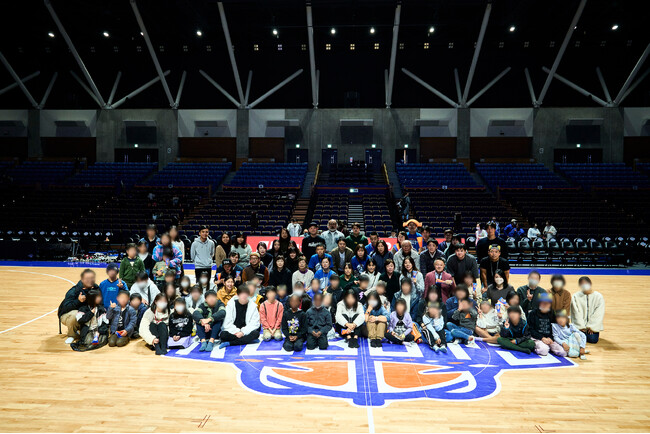試合後は、パシフィックコンサルタンツ(株)の皆さまを含め約90名でコート上にて写真撮影を行いました。 パシフィックコンサルタンツ(株)の当企画ご担当者様からは「普段観戦している茨城ロボッツの楽しい体験を子どもたちにも感じてほしかった。楽しんでもらえたようで本当によかった。」とコメントが送られ、施設の職員の方からは「このような機会は本当にありがたい。子どもたちは心から楽しんでいたように思えます」とコメントをいただきました。
