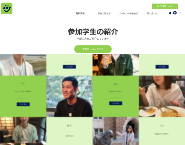 any「参加学生の紹介」ページでは、受講生のプロフィール写真のほか、所属大学・学年・any参加目的を公開しています。参加エリア・学年・ジェンダー・国籍を超えて多様な人材が集まっています。