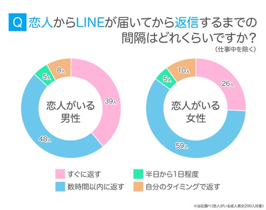 恋人がいる成人男女200人に「恋人からLINEが届いてから返信するまでの間隔はどれくらいですか?(仕事中を除く)」と尋ねたところ、最多は「数時間以内に返す」107人(53.50%)でした。