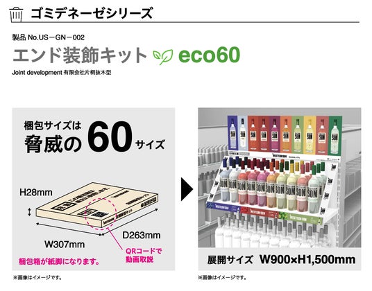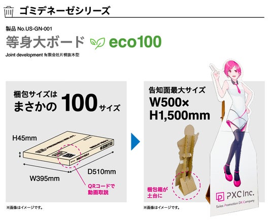 環境配慮型の販促物、SPGsブランド製品「運賃さがる君・ゴミデネーゼシリーズ」は、展開サイズが従来タイプと同じでありながら、機能や表現の範囲を損なうこと無く劇的にサイズダウンされているため、発送運賃が従来サイズより大幅に削減*1でき、これによる物量の軽減からCO2削減に繋がる製品です。また梱包箱を製品パーツとして利用することで、販促物に伴う不要なゴミが一切出ないeco設計になっています。