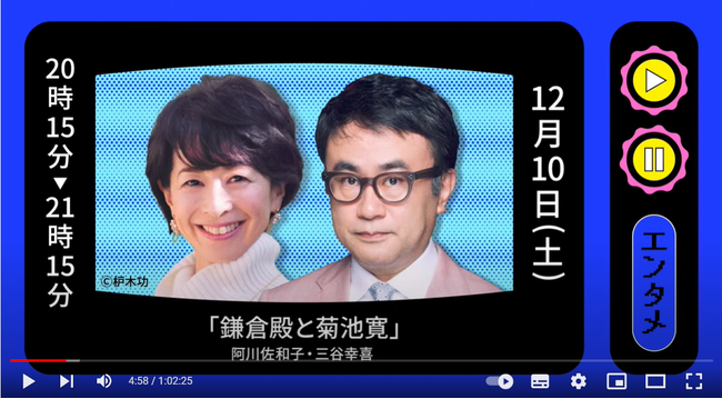 平素よりのご厚情、心より御礼申し上げます。株式会社文藝春秋(社長中部嘉人)は、文藝春秋100周年オンライン・フェスでオンエアされた三谷幸喜×阿川佐和子対談「鎌倉殿と菊池寛」の配信を再開したことをお知らせします。