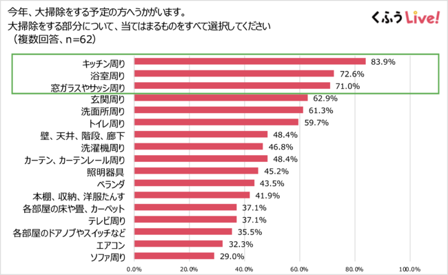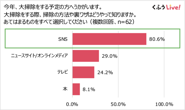 大掃除をする方へ大掃除をする部分についてたずねたところ、「キッチン周り」が83.9%、「浴室周り」が72.6%、「窓ガラスやサッシ周り」が71.0%となりました。さらに、大掃除をする際の方法や裏ワザをどうやって知るかについてたずねたところ、「SNS」との回答が80.6%で最多となりました。