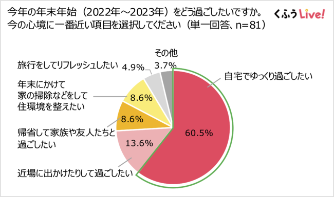 今年の年末年始の過ごし方についてたずねたところ、「自宅でゆっくり過ごしたい」との回答が60.5%で最多となりました。次いで、「近場に出かけたりして過ごしたい」が13.6%となりました。今年の年末年始もゆっくり過ごしたいと考える方が多いことがうかがえます。