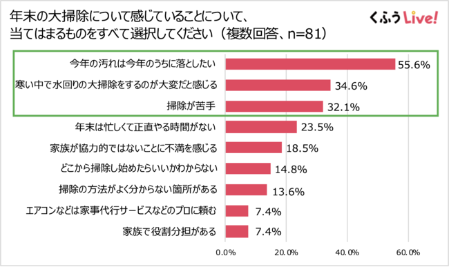 また、年末の大掃除について感じていることをたずねたところ、「今年の汚れは今年のうちに落としたい」が55.6%で最多となりました。「寒い中で水回りの大掃除をするのが大変だと感じる」との回答が34.6%、「掃除が苦手」が32.1%にのぼりました。大掃除を億劫に感じる一面がありながらも、年内に大掃除をしておきたいと考える方が多いことがうかがえます。