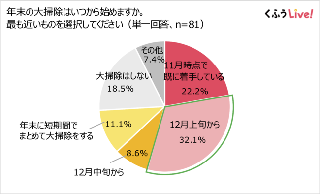 年末の大掃除を始める時期についてたずねたところ、「12月上旬から」との回答が32.1%で最多となり、次いで「11月時点で既に着手している」との回答が22.2%となりました。