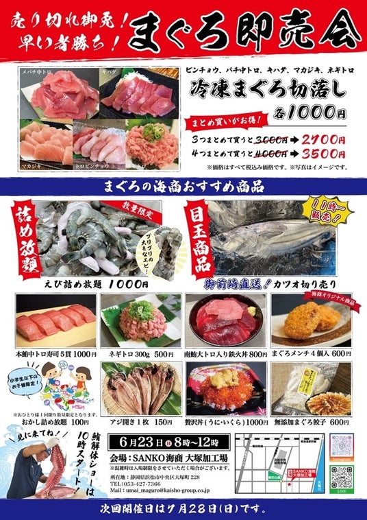2024年6月の即売会では、恒例の各種冷凍まぐろ切り落とし各種、人気の「詰め放題」企画に仕入れ担当者が厳選したブラックタイガーをご用意し、大満足の「エビの詰め放題」が登場いたします。また、名物の「まぐろメンチ」のほかに、「本まぐろ中トロ寿司」、ウニやイクラがたっぷりとのった「贅沢丼」など新たな商品もラインナップ。今開催では、小学生以下のお子様を対象にした「お菓子の詰め放題」企画も予定しており、店頭はお買い得品ばかりとなりますので、この機会をぜひお見逃しなくお楽しみいただけることを期待しております。