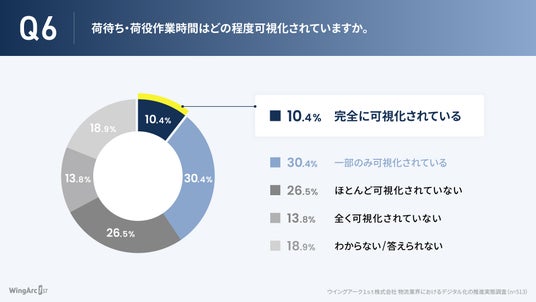 「Q6.荷待ち・荷役作業時間はどの程度可視化されていますか。」(n=513)と質問したところ、「完全に可視化されている」が10.4%、「一部のみ可視化されている」が30.4%という回答となりました。