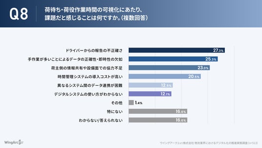 「Q8.荷待ち・荷役作業時間の可視化にあたり、課題だと感じることは何ですか。(複数回答)」(n=513)と質問したところ、「ドライバーからの報告の不正確さ」が27.3%、「手作業が多いことによるデータの正確性・即時性の欠如」が25.3%、「荷主側の情報共有や設備面での協力不足」が23.0%という回答となりました。