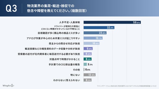 「Q3.物流業界の集荷・輸送・検収での懸念や障壁を教えてください。(複数回答)」(n=513)と質問したところ、「人手不足・人員体制」が59.6%、「ドライバーが荷待ちや荷役にどのくらい時間がかかっているか不明なこと」が32.0%、「目視確認が多く積込時の検品ミスが多い」が23.8%という回答となりました。